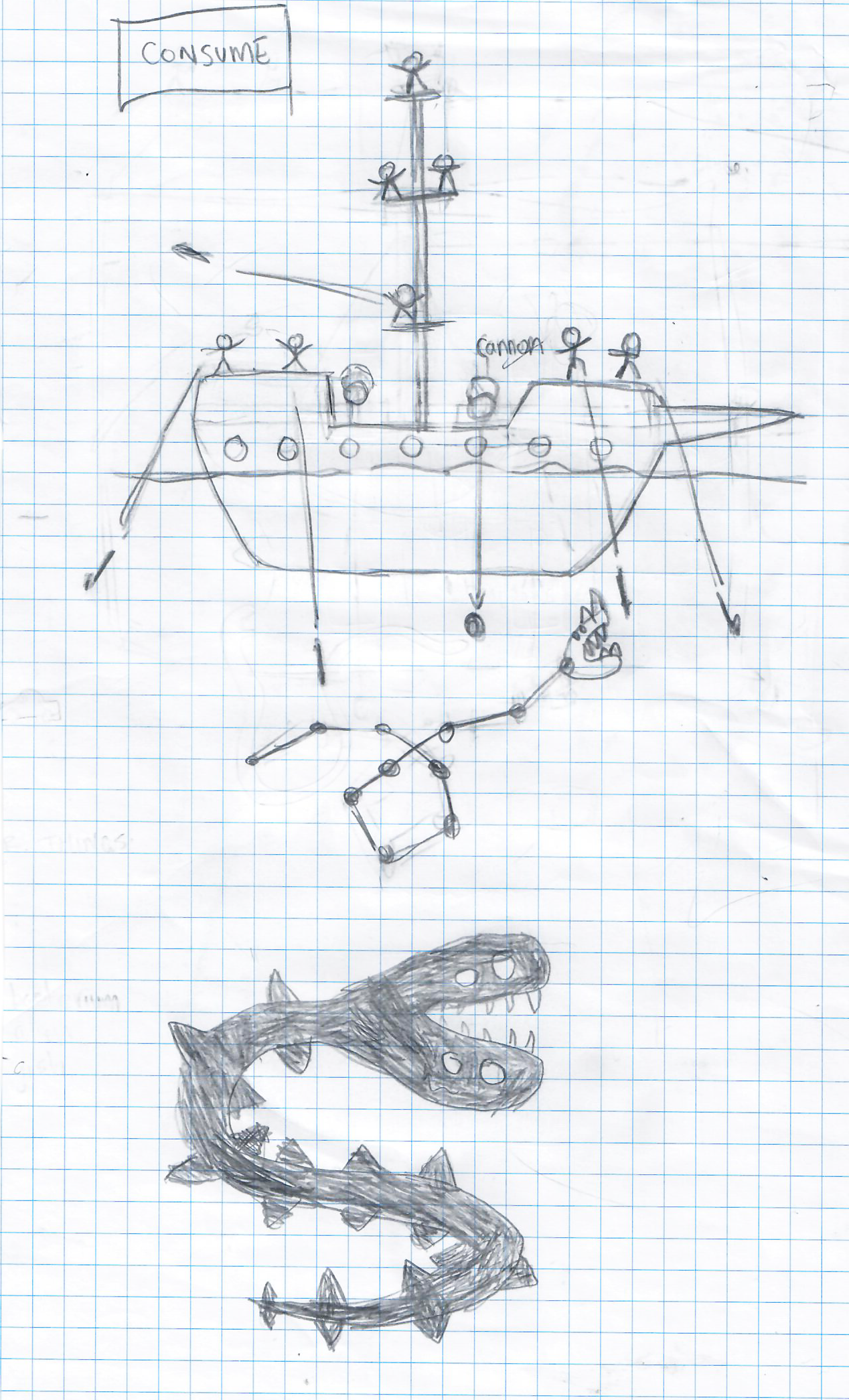 - Immediately a hungry sea serpent came to mind and I started my sketch of sailors throwing harpoons at a monster.